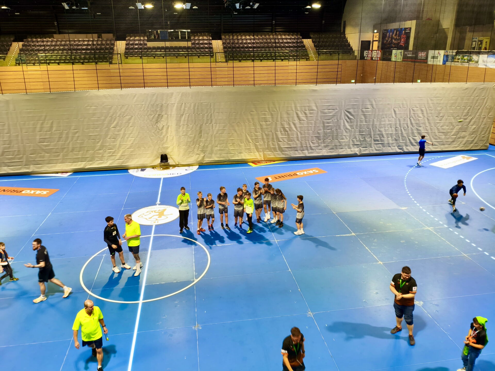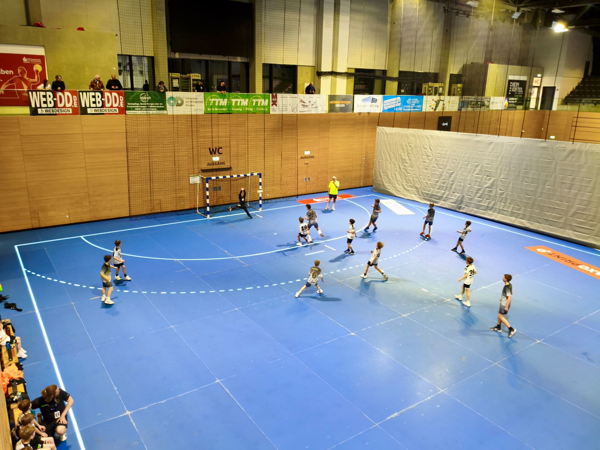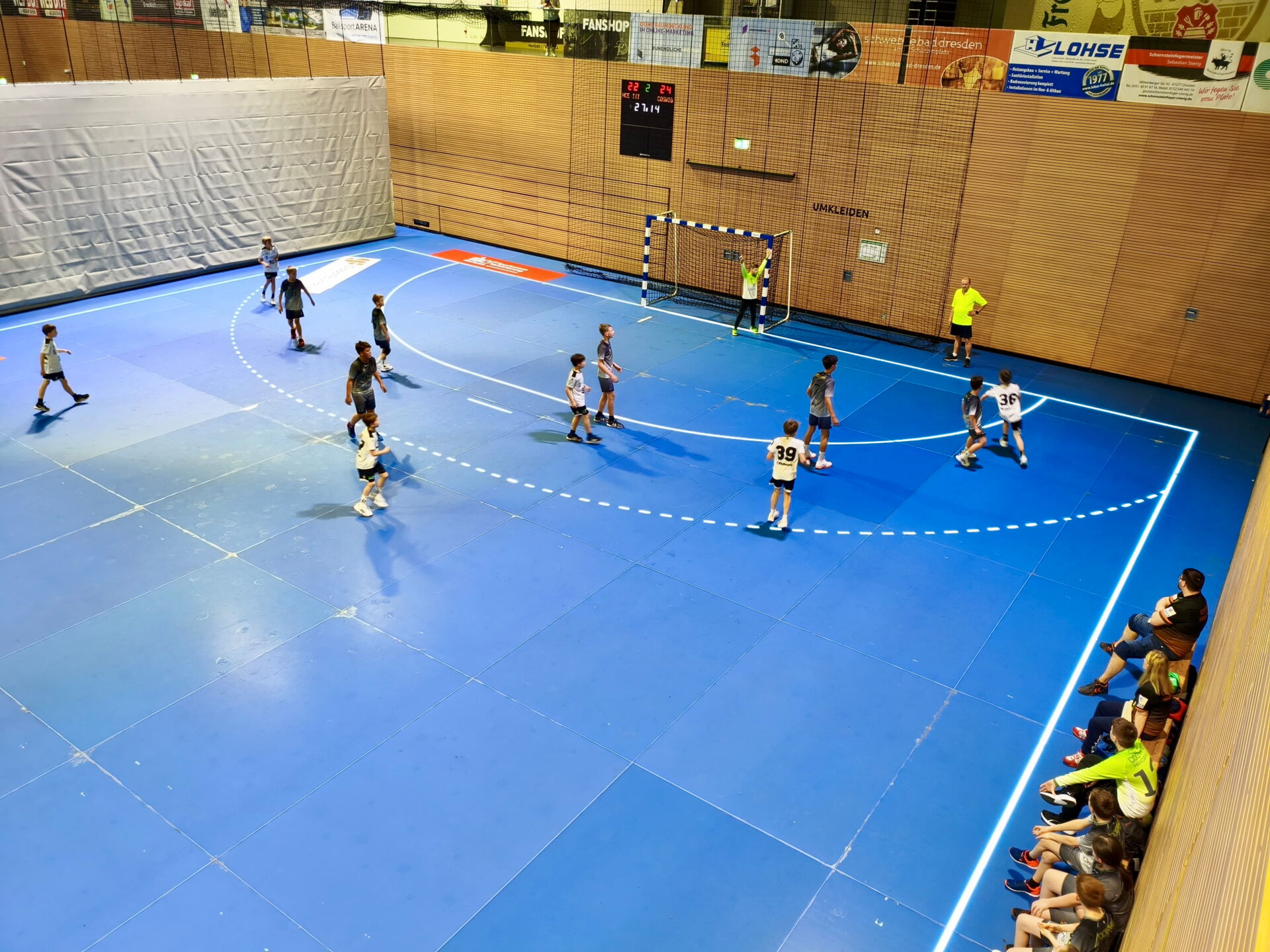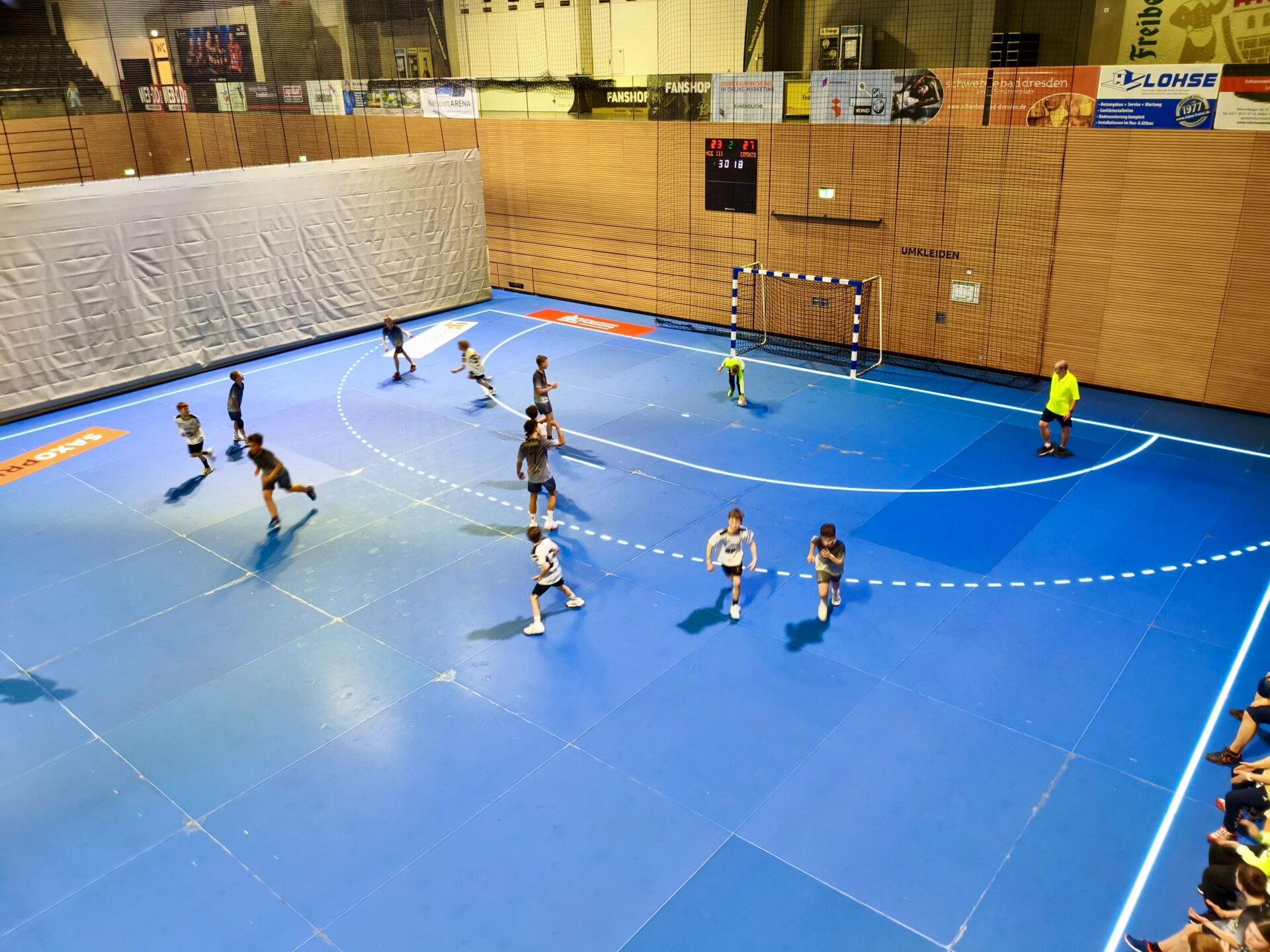 Mit dem Anpfiff in der BallsportARENA legten die Dresdner mutig los. Unsere D1 fand zunächst nur schwer in die Partie. Besonders die konsequente Manndeckung stellte uns vor ungewohnte Herausforderungen. So liefen wir über weite Strecken einem Rückstand hinterher, der in der 17. Minute bereits drei Tore betrug (12:15). Doch unsere Mannschaft steigerte sich. Mit zunehmendem Tempo und mehr Entschlossenheit kämpfte sich das Team zurück und verkürzte bis zur Halbzeit auf 16:17.